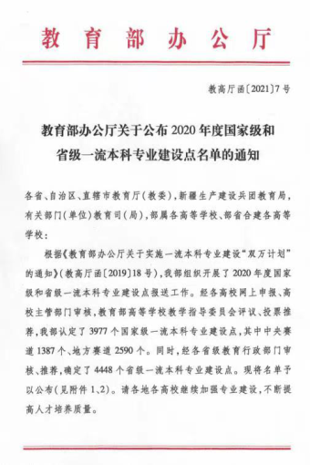 近日,教育部办公厅印发了《关于公布2020年度国家级和省级一流本科专业建设点名单的通知》(教高厅函〔2021〕7号),公布了2020年度国家级和省级一流本科专业建设点名单,我院测控技术与仪器专业同时入选国家级及江苏省级一流本科专业建设点。