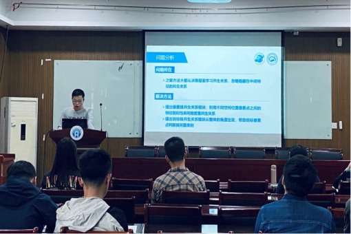 方志文同学以“基于共生关系学习的多标签航拍图像分类”为题展开汇报。他首先介绍研究任务,“该任务是对航拍图像中出现的不同类别物体进行分类,只需要图像级别的标签就能对一副航拍图像有全面的理解,可以应用于城市制图、生态监测、地貌分析、交通管制等领域。”方志文同学向低年级同学详细展示了研究的出发点、思路与创新点,他针对之前的方法大都从决策层面学习共生关系,而忽略藏在中间特征的共生关系,故而提出基于像素-目标级共生关系学习的多标签航拍图像分类方法。其中,像素级共生关系模块利用不同空间位置像素点之间的特征相似性来间接度量共生关系,并且提出目标级共生关系模块从整体的角度出发,帮助目标像素点判断其所属类别,弥补像素级共生关系模块的不足。