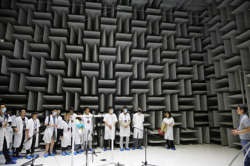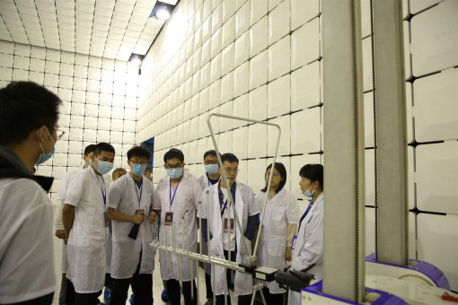 在高佳工程师的指引下,同学们穿上白褂,依次有序参观各个专业实验室。大家先后参观了电磁兼容实验室、国家互感器型式评价实验室、声学实验室、国家自动衡器型式评价实验室、50米大长度检定装置实验室。各实验室均有专业工程师现场讲解,详细地向大家介绍实验室内室的结构、材质、功效等,深入浅出讲解了实验室检测器材的应用范围、测量原理以及操作流程,并将之与社会生产结合展开生动讲解。