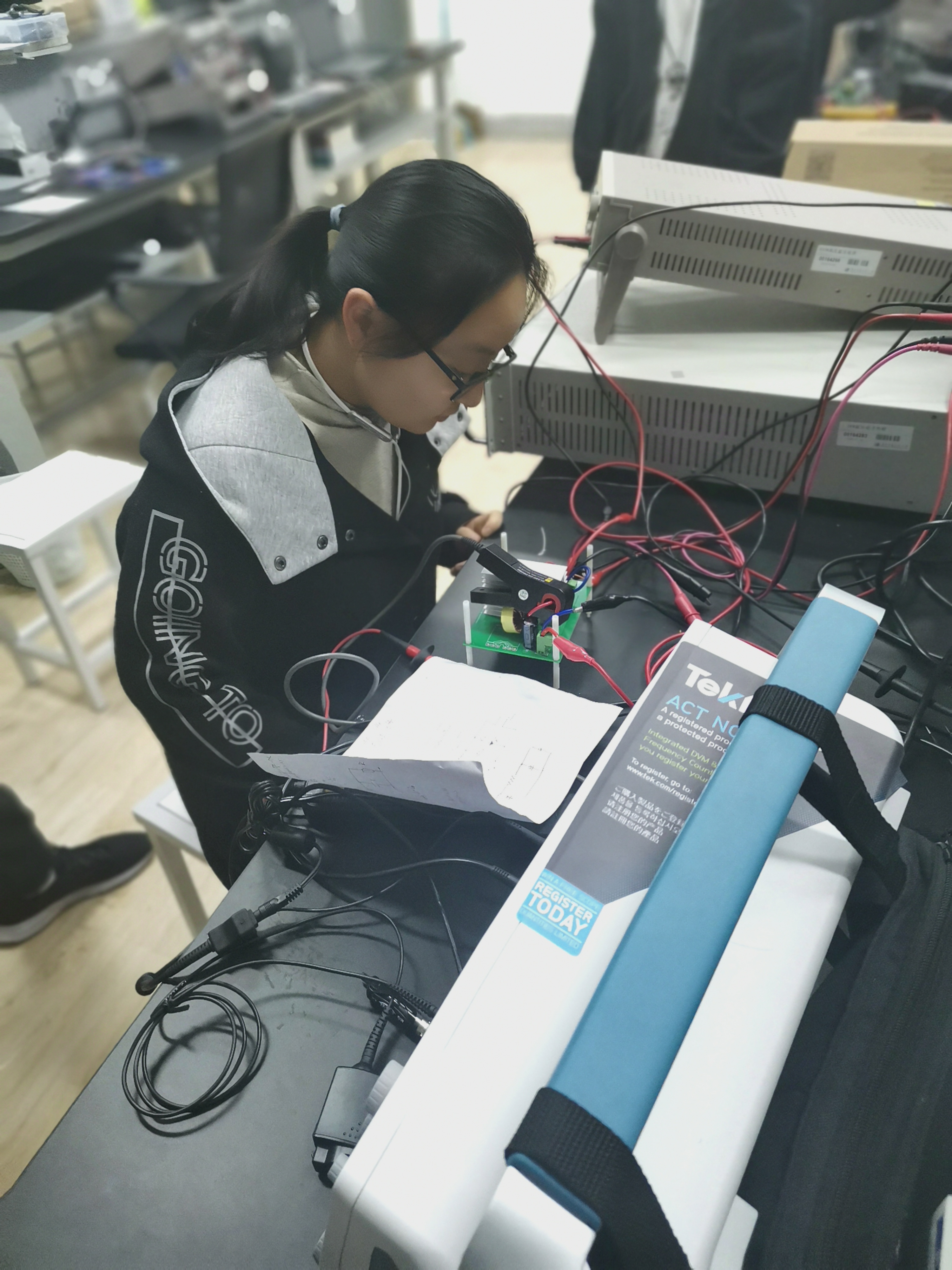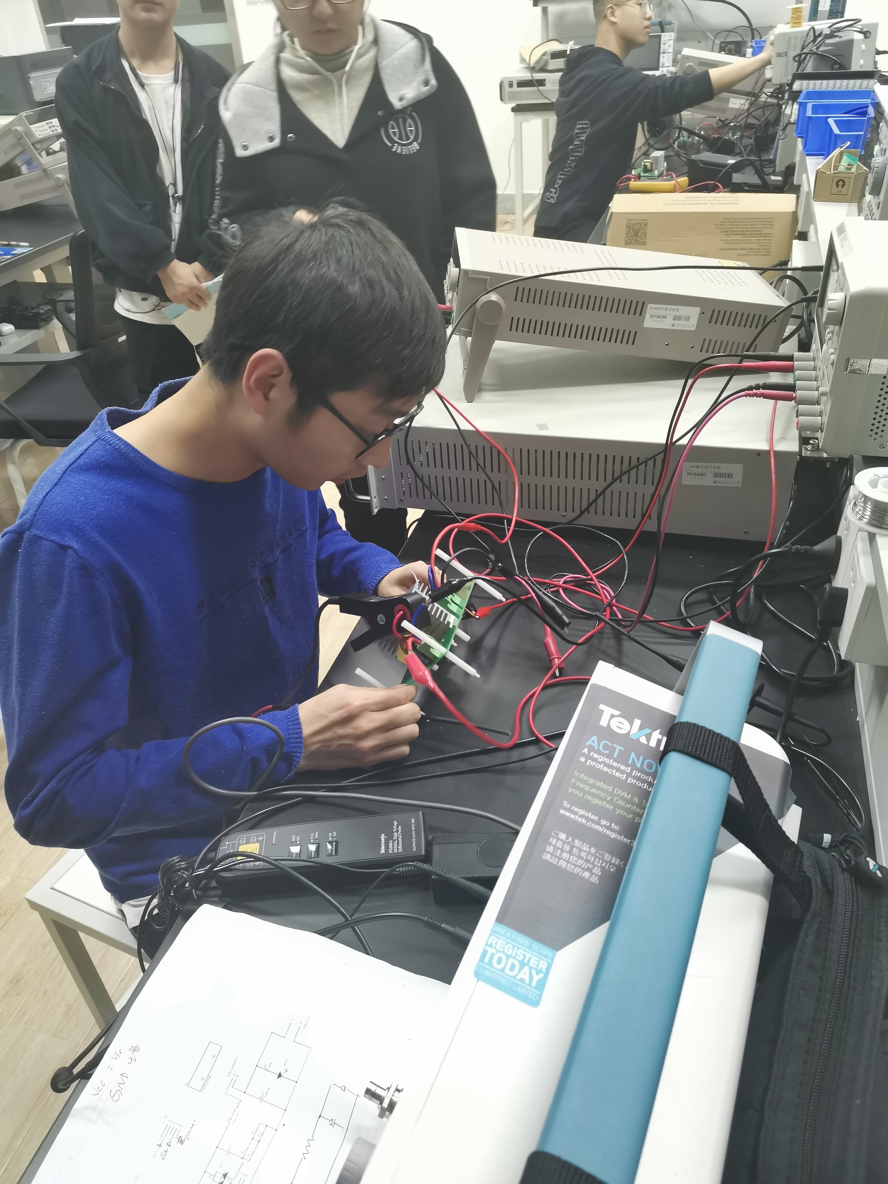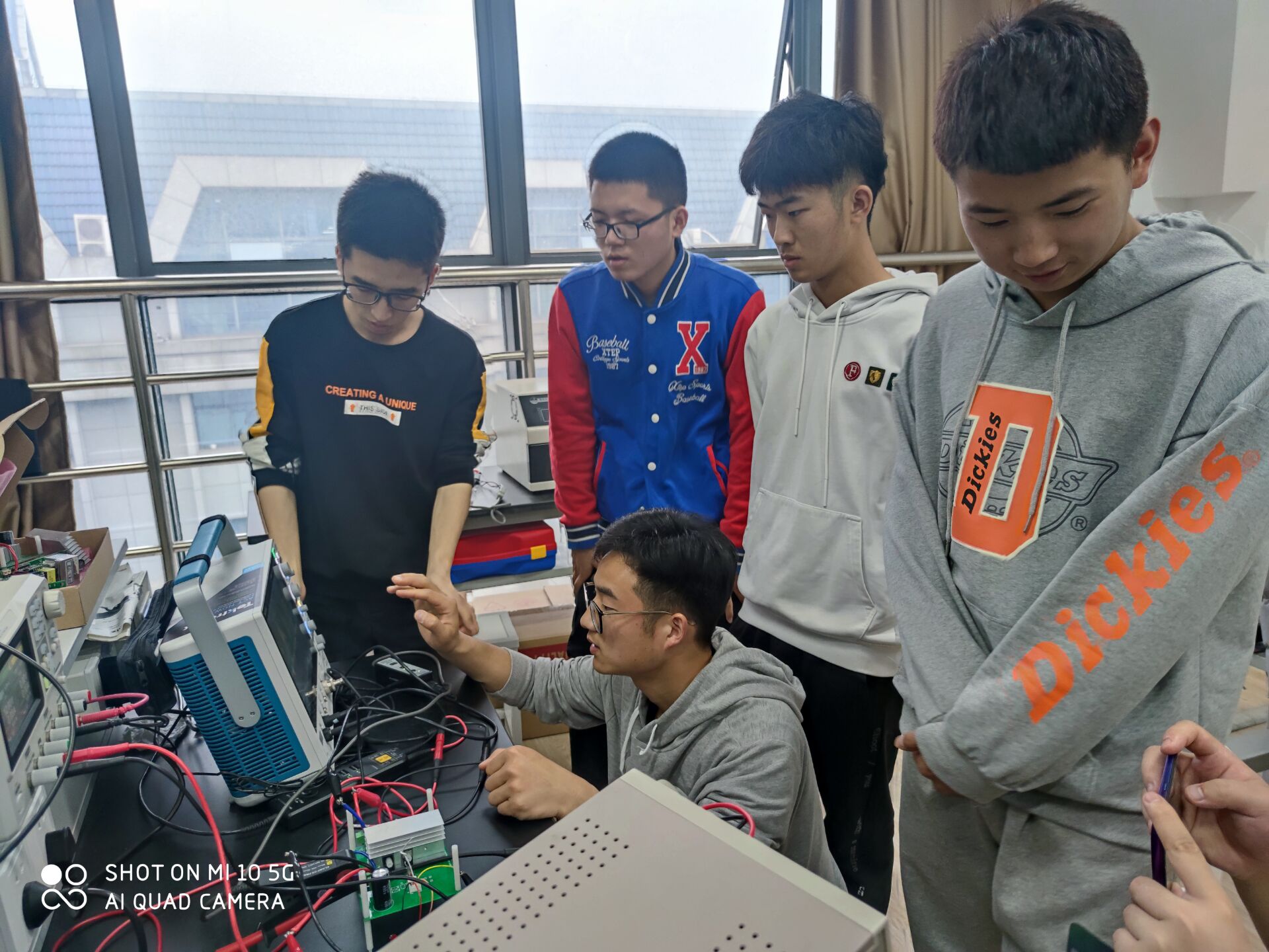 第二天上午,在经历了一晚上的知识沉淀后,学生们都已经跃跃欲试。出于人身和设备安全考虑,杨学长首先进行了变换器的加电实验演示,对接线和加电顺序进行了详细叮嘱,指出了各种操作不当会导致的后果,让小组成员充分认识到了电路操作严谨性的重要意义。然后,小组成员分别亲自进行了加电实验,测量到了详细的实验波形。实验的最后,毛老师对本次实验进行了总结,指出了该实验电路还存在的诸多问题,以及下一步改进思路。