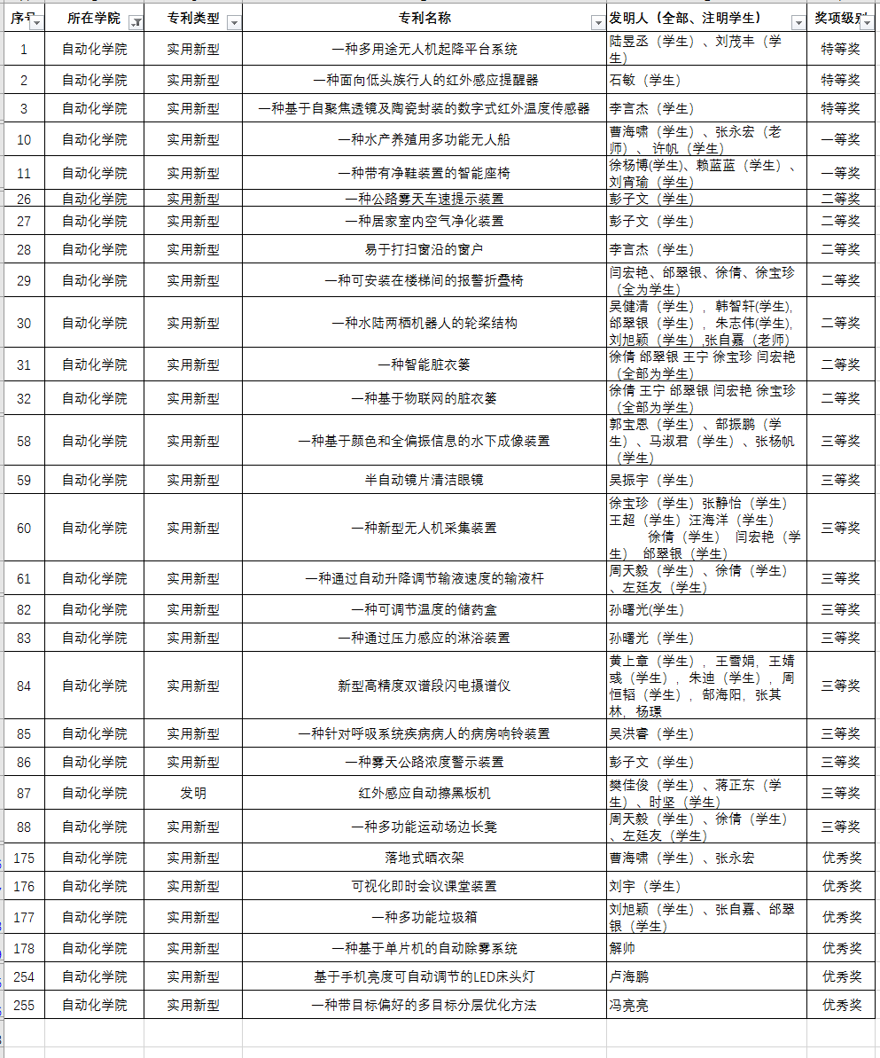 5月18日校科技产业处公布了南信大第十一届大学生奇思妙想科技创新(专利申报)大赛结果,我院共29项专利项目获奖。其中,陆昱丞、刘茂丰等4名同学的实用性专利获得特等奖(全校仅10名)。