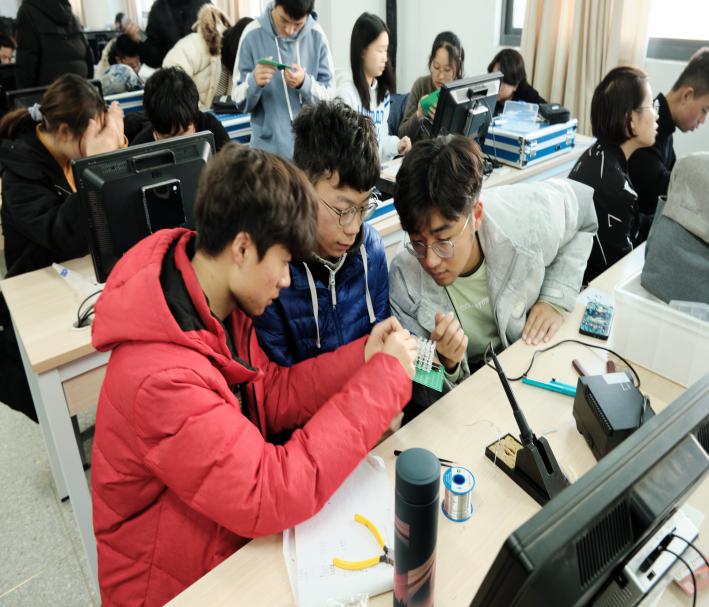 同学们用电烙铁将电阻、电容丝、开关、灯泡和其他元件一步步地焊接在电路板上后,输入程序,接上电池的瞬间,五彩的灯光在较为幽暗的实验室里显得飘渺而梦幻。此起彼伏的闪亮光芒,如银河中璀璨的星河,照亮了同学们的未来!