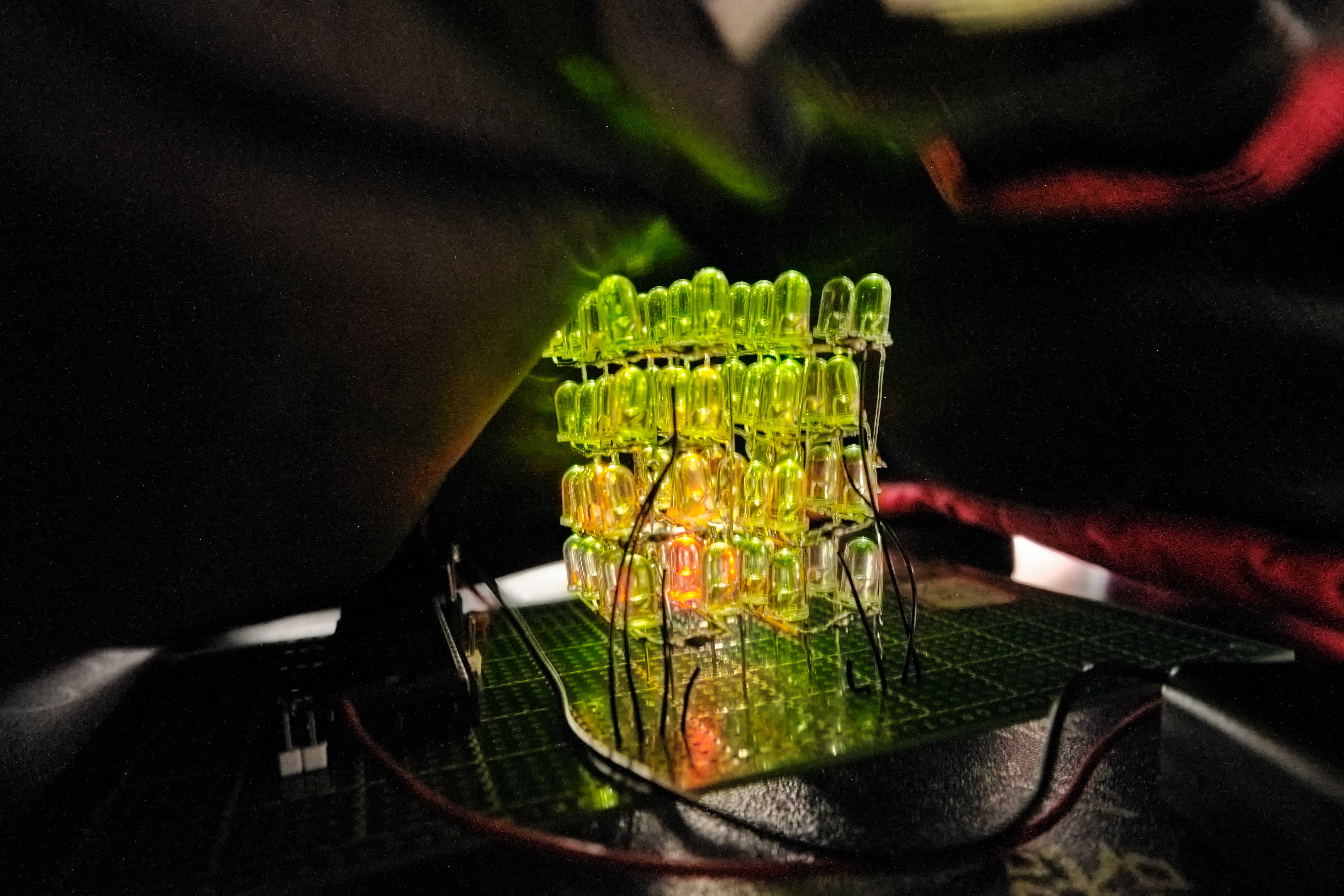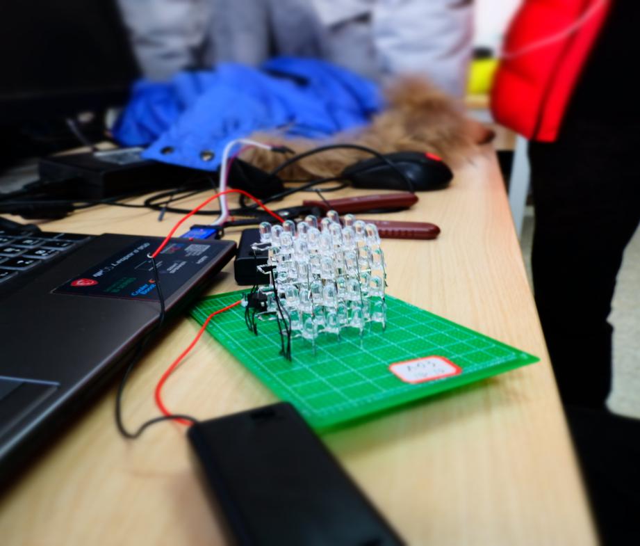 活动按照先讲解、识元件,接着了解原理,最后动手实践的流程有序进行,使得同学们能够在清晰明了地懂得制作原理后,更顺畅地制作光源立方,对于同学们遇到的疑惑,辅助的工作人员给予他们及时的讲解和答疑。