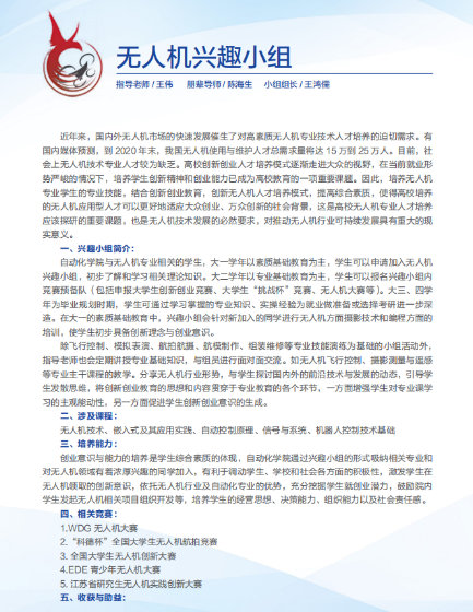 自动化学院作为一个以工科教育为主的学院,更是将培养适应国家经济发展的具有创新能力的高层次工程科技人才作为学生培养的目标和要求。在此前提下,以创新人才培养模式为驱动,自动化学院团委、科协依托学院丰富的实验室和教学中心,整合资源,组建了智能车、专利设计、互联网+等十余个科创兴趣小组,并且为每个兴趣小组配备了富有经验的指导教师,以学科竞赛为引领,以实际科研项目为支撑,在指导教师有计划、有步骤的培训和指导下,逐步培养和加强学生实践创新能力和团队协作意识。科创兴趣小组的成立为学生充分利用学院的实践教学资源加强自身专业知识学习,激发科技创新热情,提高科技创新能力提供了有效的平台。希望每一位同学都能加入到科创兴趣小组中来,在这里与你志同道合的朋友,切磋交流,相互学习,共同进步。