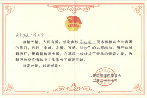 共青团徐州市贾汪区委员会向我校青年志愿者寄发感谢信