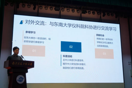 会上,我院科协主席丁明强同学代表自动化院科协进行宣讲。他详细地为全校同学介绍了我院科协近期开展的各类特色活动,生动讲述了我院科协双创实践能力培训班、口袋实验室、竞赛讲座和实验室开放日等常规活动,特别介绍了我院科协光立方、固体火箭等趣味性比赛。“本月,我院科技活动月正如火如荼地开展。我们策划了丰富多样的活动,积极与外校科技和创新类协会组织合作交流,并策划举办恒温箱控制监测大赛、机器人竞速大赛、高空无人机气象检测大赛和电力电子设计基础技能大赛等独具学院专业特色的比赛。”他的精彩演讲吸引了众多学生,现场宣讲效果较好。