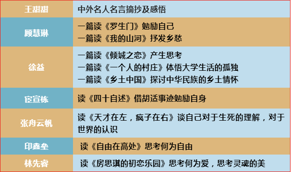 《关于鲁迅先生<药>的解读》一篇,对鲁迅先生的文章抒发了自己的感想,作者从明暗两条线入手,解读分析了文章对当时社会黑暗的抨击。余秋雨的《文化苦旅》中《我的山河》一篇,作者通过学校里一处酣睡的小猫,勾起了自己对“故乡”、“乡土”的情感,通过《我的山河》中作者的见解,发出“正所谓心安处是吾乡”、“最触动人的是一草一木,而不是一整个庞大的存在”的感触,引人对“乡愁愁的到底是故土还是故时”的思考。胡适《四十自述》读书笔记一篇,作者通过阅读该人物传记,了解人物在特定时代里的成长与无奈,联想到当下青年的时代责任,并得出“一个人的青年时期是影响一个人最关键的一个阶段”的感悟,勉励自己时刻铭记自己的志向,不忘初心,砥砺前行。《林清玄:马蹄兰的告别》一篇,作者通过马蹄兰的形态、生长环境,得出一种生活态度。在拼搏中享受,在享受中拼搏,把挫折成长当做生活的调味剂,心中存有梦想,在平凡的生活中感受淡淡的温馨和满足。