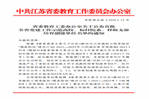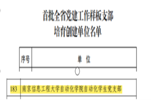 5月7日,江苏省委教育工委下发了《省委教育工委办公室关于公布首批全省党建工作示范高校、标杆院系、样板支部培育创建单位名单的通知》,自动化学院自动化学生党支部入选首批全省党建工作样板支部培育创建单位。