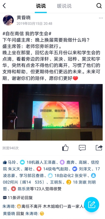 时间追溯至2019年3月15日,这天晚上泽轩这一届主席团的孩子们换届,面试结束返回家的公交车上我眼眶含泪地敲下一段话,这是我第一次因为这群孩子们内心有了无比空落落的感觉:对泽轩,我顶顶喜欢的就是他的踏实能干和他一个暑假几乎没有休息过的曾经;对于小吴,我最最喜欢的就是他的成熟懂事和虑事周全;对于冠桦,我最念念不忘地就是他带着体育部的小伙伴们奋力拼搏的样子;对于昊汶,我最最佩服他真心实意为彼时信控院的孩子们成长考虑到的一系列创新想法,譬如双创能力提升培训班,譬如星空虾播;对于宇华,印象最为深刻地还是他的靠谱、善良和踏实可爱。