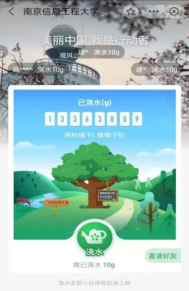 为了响应植树节的号召,木木姐工作室现推出了蚂蚁森林浇水活动。活动期间,参与蚂蚁森林南京信息工程大学公益林浇水活动,不仅可以自己浇水,也可以邀请小伙伴浇水,浇水量越多,奖品就越丰厚哦!