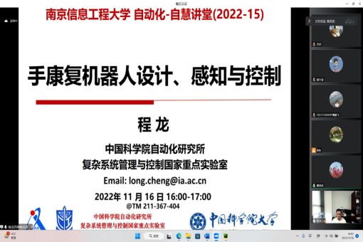 11月16日,我院特邀中国科学院自动化研究所程龙研究员做线上学术报告,报告题目为“手康复机器人设计、感知与控制”。本次报告由我院副院长葛泉波教授主持,报告吸引了百余名师生线上参与。