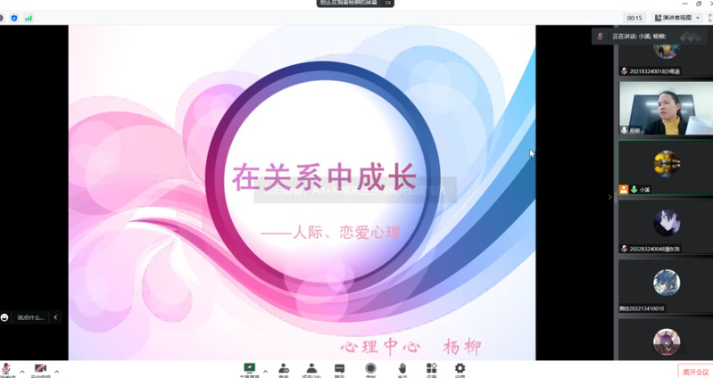 针对在校大学生因各种人际关系所困扰的现状,10月5日下午,自动化学院特邀心理中心专职老师杨柳给大家带来“相逢是首歌——在关系中成长”专题讲座。各班的心理委员和部分学生现场参会,其余学生线上同步参加。