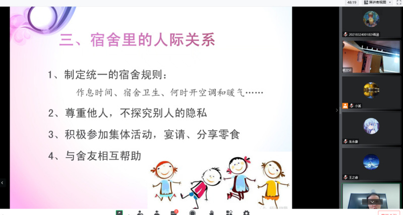 在谈及如何处理好宿舍里的人际关系时,杨老师分析了一些宿舍人际冲突的现象,也给出了几点建议供大家参考,一个乐于互助的人,永远可以收获更多的友谊,宿舍生活需要沟通、协商,甚至迁就,这样宿舍氛围就会更融洽。