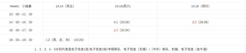 本次比赛共计五支队伍,分为A、B组进行积分淘汰赛,并由每组的前两名跻身半决赛进行下一阶段的比拼。他们分别是来自A组的南京电子信息1班,南京电子信息2班/控制科学与工程联队,无锡电子信息/电子信息(中外合作)联队,以及来自B组的机械,金牛湖电子信息。
