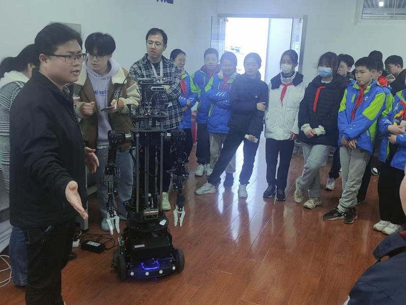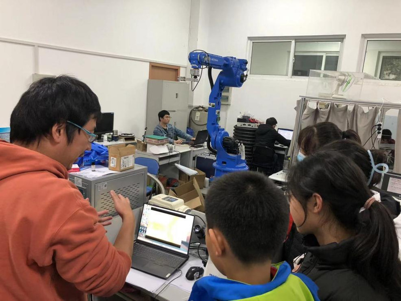 走进实验室后,老师们和志愿者们用通俗易懂的语言为小朋友们讲解。首先机器人社团的陈彦霖同学向孩子们细致展示了机器人实验室中人形机器人的设计理念和每个部分的作用,小朋友们听得津津有味。