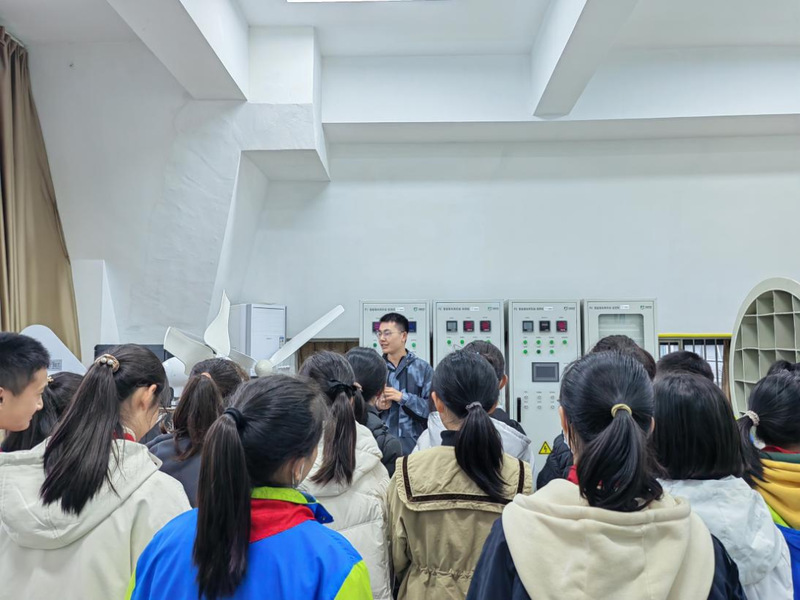 游历完智能车实验室,新能源电力电子技术社团的志愿者吴新懿同学带领着孩子们来到了新能源电力电子实验室,他从新能源引入话题,询问同学们什么是新能源,使用新能源的好处有哪些,小朋友们积极回答。之后吴新懿带领大家观看了风力发电机模型,风力发电机由叶片,传动装置,发电机,机匣等部分构成。小朋友们眼睛紧盯着模型,生怕漏掉任何讲解内容。之后吴新懿着重介绍了风光互补控制机柜,小朋友们了解到风光互补系统相对于单一的光伏发电或风力发电,有发电效率高,系统智能化程度高等优点。
