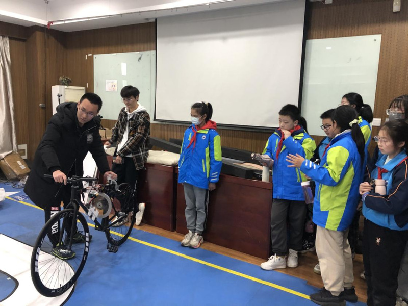 参观智能车实验室时,现场的孩子们都跃跃欲试,来自电子设计社团的志愿者许烨枫同学展示了无人驾驶的自行车如何实现无人驾驶,驾驶中可能会遇到的困难和解决方案,小朋友们听得聚精会神。
