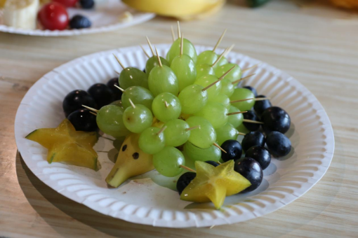 瞧!大家的水果和各种使用材料迅速准备齐全,同学们马上开始行动,有切橙子的、有剥香蕉的、有洗草莓的、还有负责吃边角料的……伴随着欢声笑语,经过大家的精雕细琢,一盘盘造型精美、果香四溢的水果拼盘“新鲜出炉”了。有的水果笑的合不拢嘴,有的水果变成了“点睛之果”,有的水果成了绿色的“小刺猬”。每一种水果,都有属于它自己的颜色和心情。每一件作品,都有属于它自己的创意和价值。