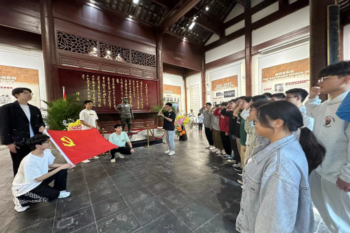 在江苏省爱国主义教育基地、江苏省文物保护单位——新四军一支队司令部旧址,讲解员向大家介绍道,高淳是新四军一支队东进抗日、进入苏南地域的第一站。司令员陈毅在高淳期间,积极开展党的统一战线工作,走访国民党县长杨鼎侯和地方士绅,向他们宣传新四军的宗旨和抗日统一战线政策。在支部副书记杨超允的带领下,党员们面向陈毅司令雕像和鲜艳的党旗,庄严重温入党誓词。