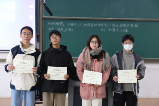 决赛的辩题是“灾难中的人们更被英雄的背影/彼此的歌声鼓舞”。双方选手经过充分的准备、认真的思考,在立论、驳论、对辩等环节中充分展现了缜密的思辨能力、娴熟的辩论技巧、机智的应变能力,为大家献上了一场难忘的高质量视觉盛宴。比赛进行至“正/反方三辩盘问反/正方一二四辩”的环节,双方三辩都紧抓对方论述漏洞,气氛在环环相扣、步步紧追的诘问中一次次涌向高潮。而在自由辩环节,双方更是火力全开,抓住辩题蕴含的“信念”之内涵,基于新冠疫情、汶川大地震等灾难中的真实事迹,展开了一轮又一轮掷地有声的论述,生动诠释了“一人之辩重于九鼎之宝,三寸之舌强于百万之师”的辩论盛况。比赛结尾,评委深入剖析辩题,对双方选手给予了肯定并做出了最后的评判:正方电气2班获得新生辩论赛冠军、正方二辩杭天堃摘得决赛“最佳辩手”的桂冠。