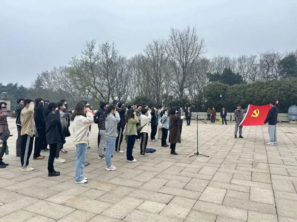 在庄严肃穆的雨花台烈士纪念碑前,大家怀着崇敬的心情,向长眠于此的革命烈士鞠躬并敬献花圈。随后,大家在纪念碑前重温入党誓词,坚定理想信念。本科生第一党支部陈静茹表示,雨花台是一个山清水秀、风景宜人的地方,却也是中国共产党人和革命志士的刑场,有成千上万的革命烈士在这里牺牲,他们牺牲时候平均年龄还不到30岁,最小的年仅16岁。在灵魂和肉体的双重考验下,他们用生命践行了自己对党和人民的承诺:“信仰至上,慷慨担当,舍身为民,矢志兴邦”。他们将自己的生命点燃,发光发热,照亮祖国的光明未来,这样的坚定信念使我们受用终生。