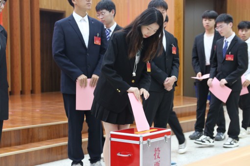 随后各组织主席团候选人进行了现场展示,大会代表认真履行自身职责,本着民主、公平、公正的原则采取无记名投票方式选出了新一届团学组织成员。柯清言同学当选新一届学生会主席,陈嘉彤同学当选新一届团委副书记,陆宸玉同学当选新一届青协主席,周孜晗同学当选新一届科协主席。