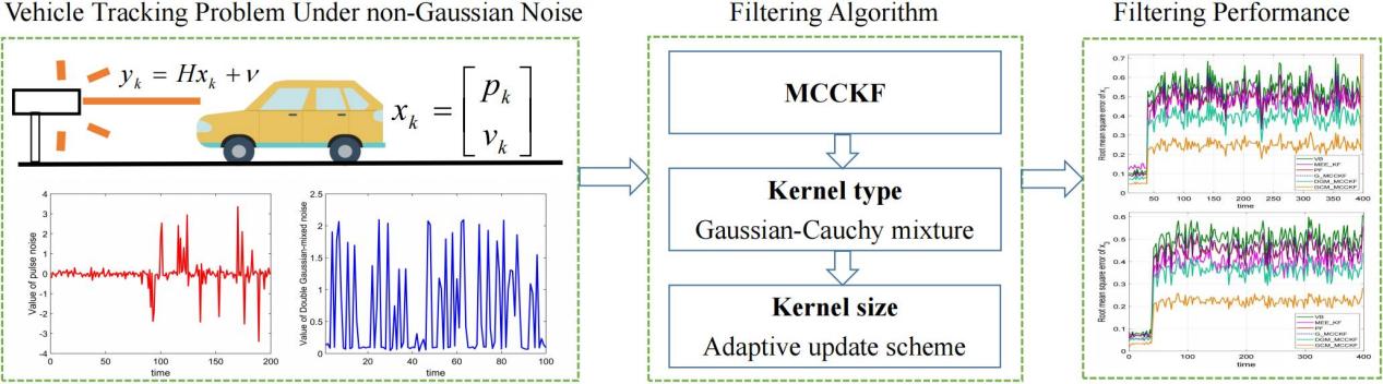 近日,自动化学院葛泉波教授团队的研究工作《Gaussian-Cauchy Mixture Kernel Function Based Maximum Correntropy Criterion Kalman Filter for Linear Non-Gaussian Systems》被IEEE Transactions on Signal Processing录用,该论文的合作是博士生白雪飞。 IEEE Transactions on Signal Processing是工程技术领域的国际一流期刊(影响因子为4.6),JCR一区期刊,更是信号处理领域权威Top期刊,历来以水平高、送审难及录用率低著称。本研究主要针对线性系统中由于重尾非高斯噪声污染导致估计性能下降的问题,提出了一种基于Gaussian与Cauchy核函数凸组合的混合核函数核自适应最大相关熵准则(MCC)Kalman滤波算法。该方法提高了在非高斯噪声条件下的估计性能和灵活性,增强了基于MCC准则滤波器的适用性。整体研究框架如图1所示。
