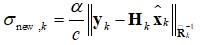 (2)核大小是基于混合函数的MCC滤波算法中的关键参数,对滤波器性能有显著影响。 针对固定核大小的局限性,我们结合已有技术与创新元素,引入了一种自适应核大小机制,有效解决了现有MCC滤波器的不足。该机制从测量数据和系统模型的角度出发,并在此基础上通过引入马氏距离改进自适应核大小更新,将噪声参数纳入调节过程,进一步提高了滤波精度。自适应核宽更新规则设计如下: