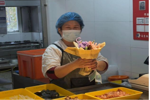 活动当天,参与者们早早地聚集到指定的活动场地。活动室桌上摆放着五彩斑斓的扭扭棒、剪刀等工具。在志愿者的简要介绍和示范后,大家迫不及待地开始动手制作。同学们挑选自己喜欢的颜色,将扭扭棒在手中巧妙地编织、扭曲、粘贴,一个个精美的作品逐渐呈现在大家眼前。每一件作品都凝聚着参与者的心意与创意,也展现着他们的个性和风采。他们在卡纸上写下自己最真挚的祝福语,将花朵包裹成束,一个个生动有趣的作品最终成形。紧接着,同学们带着花束,走到校园的各个角落,将这些花束献给在我们身后默默奉献的后勤保障人员。