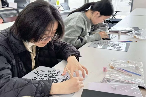 在“巧作绽芳华”环节中,活动志愿者为参与者准备了干花、团扇、彩绘工具等丰富的手工材料,提供了一次展现学生创新与巧思的活动机会。活动教室里,参与者全神贯注,在志愿者的悉心协助下,他们尽情发挥创意,制作出一个个各具特色的干花团扇与金箔画。同学们在团扇上写下美好的祝福:“愿每一位女性都能勇敢追梦,绽放光彩。”“愿我们的美丽与智慧永远熠熠生辉!”整个活动过程井然有序,充满了温情,参与者们沉浸其中,收获满满。