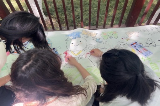 在轻松愉悦的氛围中,“接力绘画” 环节拉开帷幕。各小组需通过接力创作完成一幅主题画。同学们热情高涨,纷纷执笔上阵:有人用蓝色描绘浦口公园的湖水,有人用绿色点缀生机盎然的草木,有人用金色勾勒梦想的轮廓…… 画笔在成员间传递,线条与色彩逐渐交织成一幅幅充满创意与温情的作品。创作过程中,笑声与讨论声此起彼伏,同学们沉浸在艺术表达的乐趣中。最终,一幅幅主题鲜明、风格各异的画作展现眼前,既有对自然美景的描绘,也有对未来科研与生活的憧憬。这些作品不仅是团队协作的结晶,更成为同学们抒发内心、传递正能量的载体。活动临近结束时,参与的一位研究生分享道:“情绪表达让我学会用不同视角理解情绪,接力绘画则让我看到团队合作的创造力,这样的活动很有意义!”