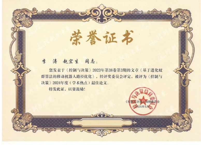 2025年5月16日-19日,第37届中国控制与决策会议(CCDC 2025)在中国厦门市举行。会议前期,控制与决策评奖委员会组织了严格的专家评审,经终审讨论,仅有5篇文章从众多成果中脱颖而出,荣获《控制与决策》2024年度(学术热点)最佳论文奖,我院李涛教授的文章《基于进化蚊群算法的移动机器人路径优化》位列其中。