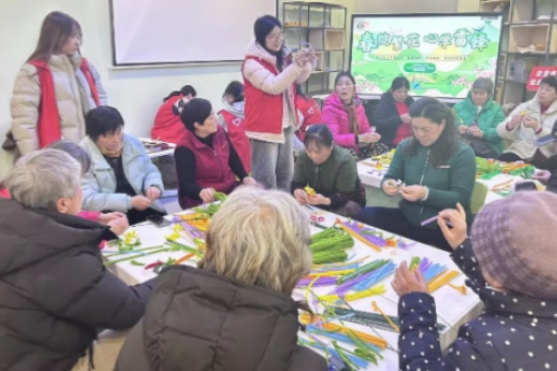 活动当日,党员同志们分为两组同步开展服务。手工服务组以扭扭棒花束DIY为载体,与社区老人围坐一堂,耐心指导老人制作花束。从花瓣轮廓的扭制到花束造型的整理,志愿者们悉心讲解、反复示范,老人们在动手实践中感受创作的乐趣与陪伴的温暖,现场氛围温馨融洽。