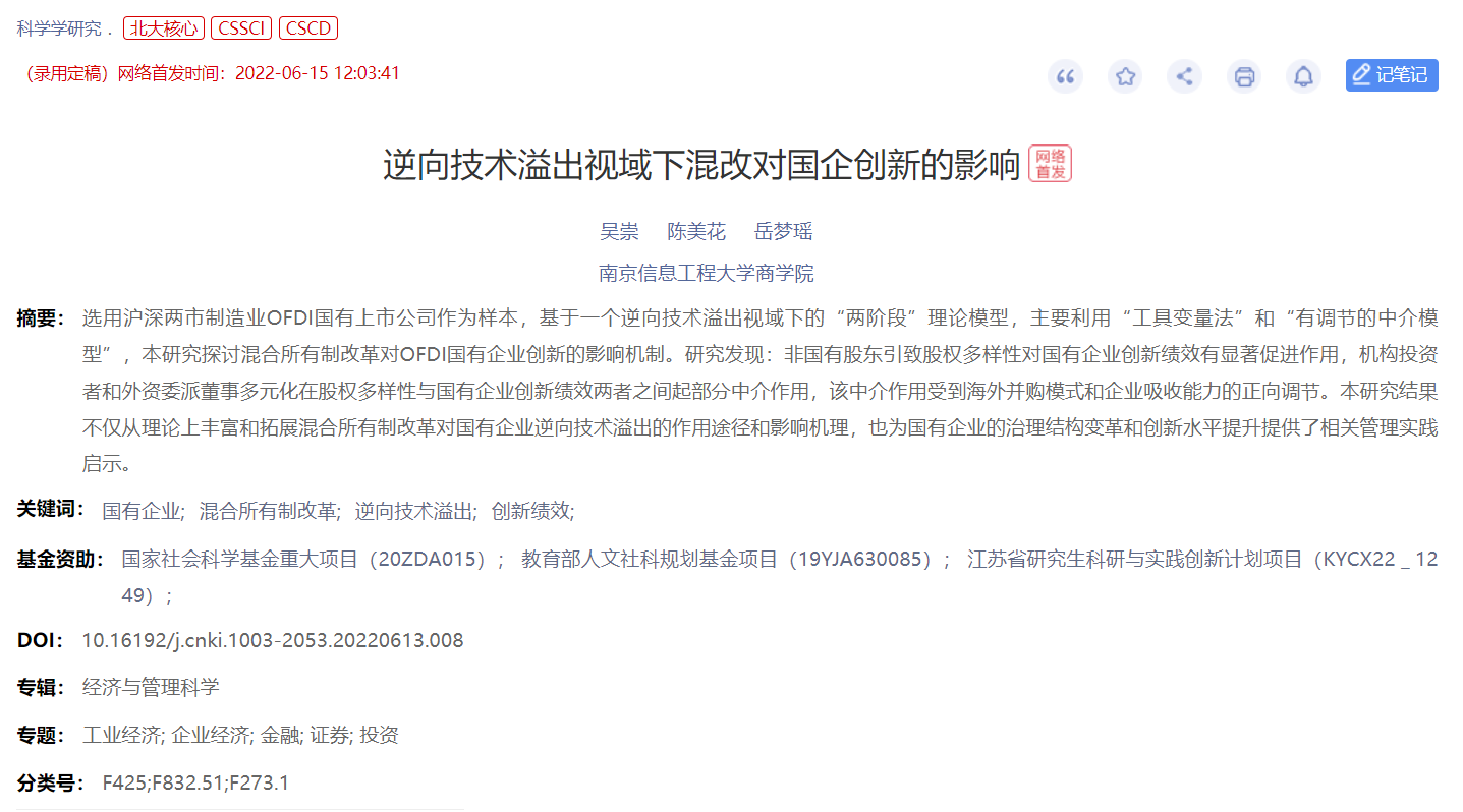 近期,我院吴崇教授以第一作者和所指导学生陈美花、岳梦瑶,于2022年6月在权威期刊《科学学研究》上,发表《逆向技术溢出视域下混改对国企创新的影响》论文一篇。该文选用沪深两市制造业 OFDI 国有上市公司作为样本,基于一个逆向技术溢出视域下的“两阶段”理论模型,主要利用“工具变量法”和“有调节的中介模型”,探讨混合所有制改革对 OFDI 国有企业创新的影响机制。研究发现:非国有股东引致股权多样性对国有企业创新绩效有显著促进作用,机构投资者和外资委派董事多元化在股权多样性与国有企业创新绩效两者之间起部分中介作用,该中介作用受到海外并购模式和企业吸收能力的正向调节。本研究结果不仅从理论上丰富和拓展混合所有制改革对国有企业逆向技术溢出的作用途径和影响机理,也为国有企业的治理结构变革和创新水平提升提供了相关管理实践启示。