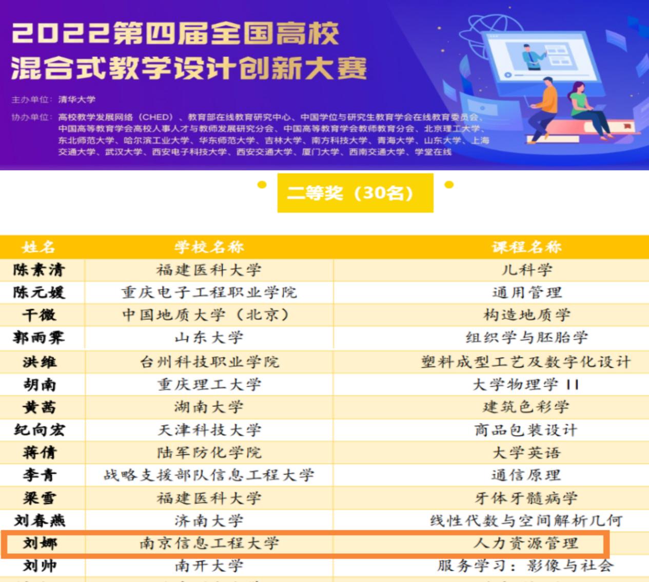 2022年11月26-27日,清华大学主办、上海交通大学承办的2022年第四届全国高校混合式教学设计创新大赛决赛于线上隆重举行。南京信息工程大学商学院教师刘娜和团队的参赛课程《人力资源管理》在全国决赛环节荣获二等奖,成为南京2所入围决赛获奖高校之一。