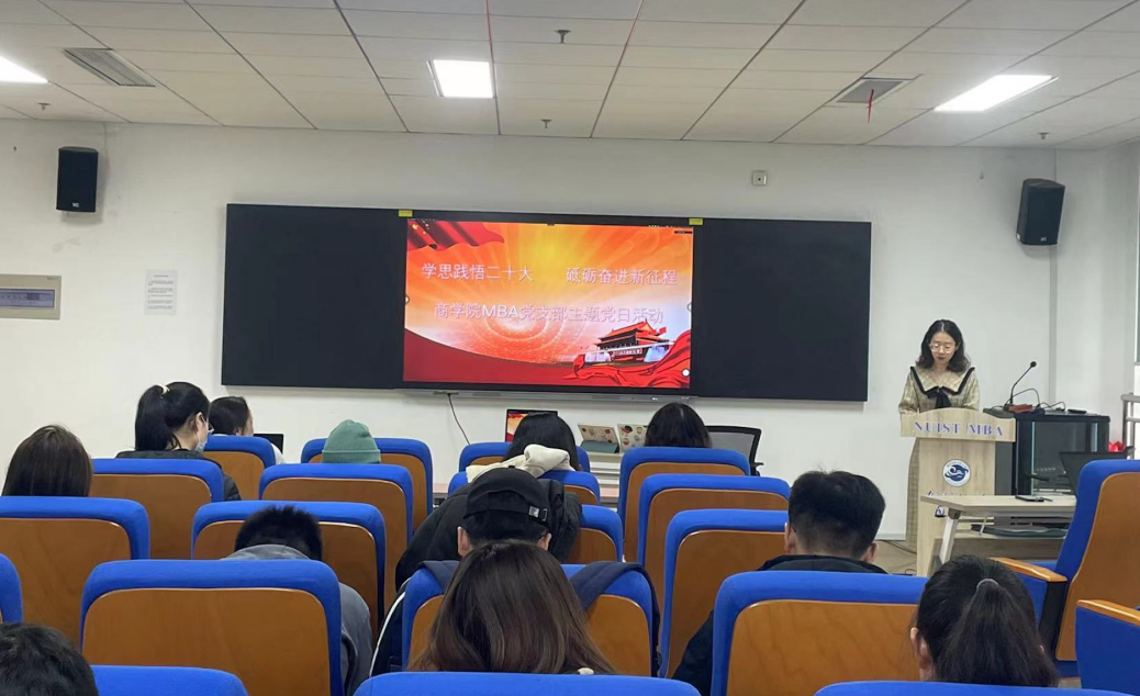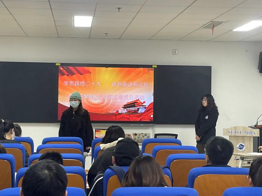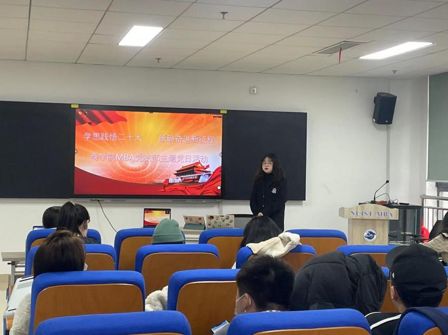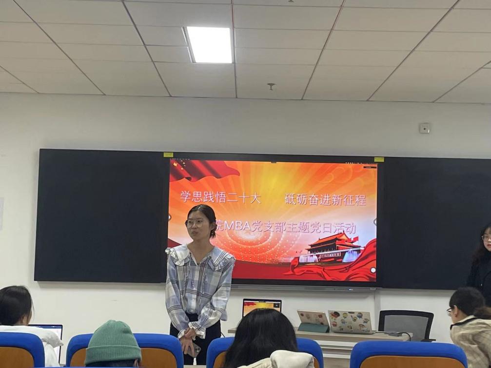 为深入学习贯彻党的二十大精神,力求学思用贯通、知信行统一,引领支部广大青年坚定信心跟党走,支部于2022年12月7日下午在阅江楼426成功开展了“学思践悟二十大,砥砺奋进新征程”主题党日活动。党支部组织委员许飘宇主持,MBA专业全体党员、发展对象、入党积极分子和积极向党组织靠拢的研究生同学参加。