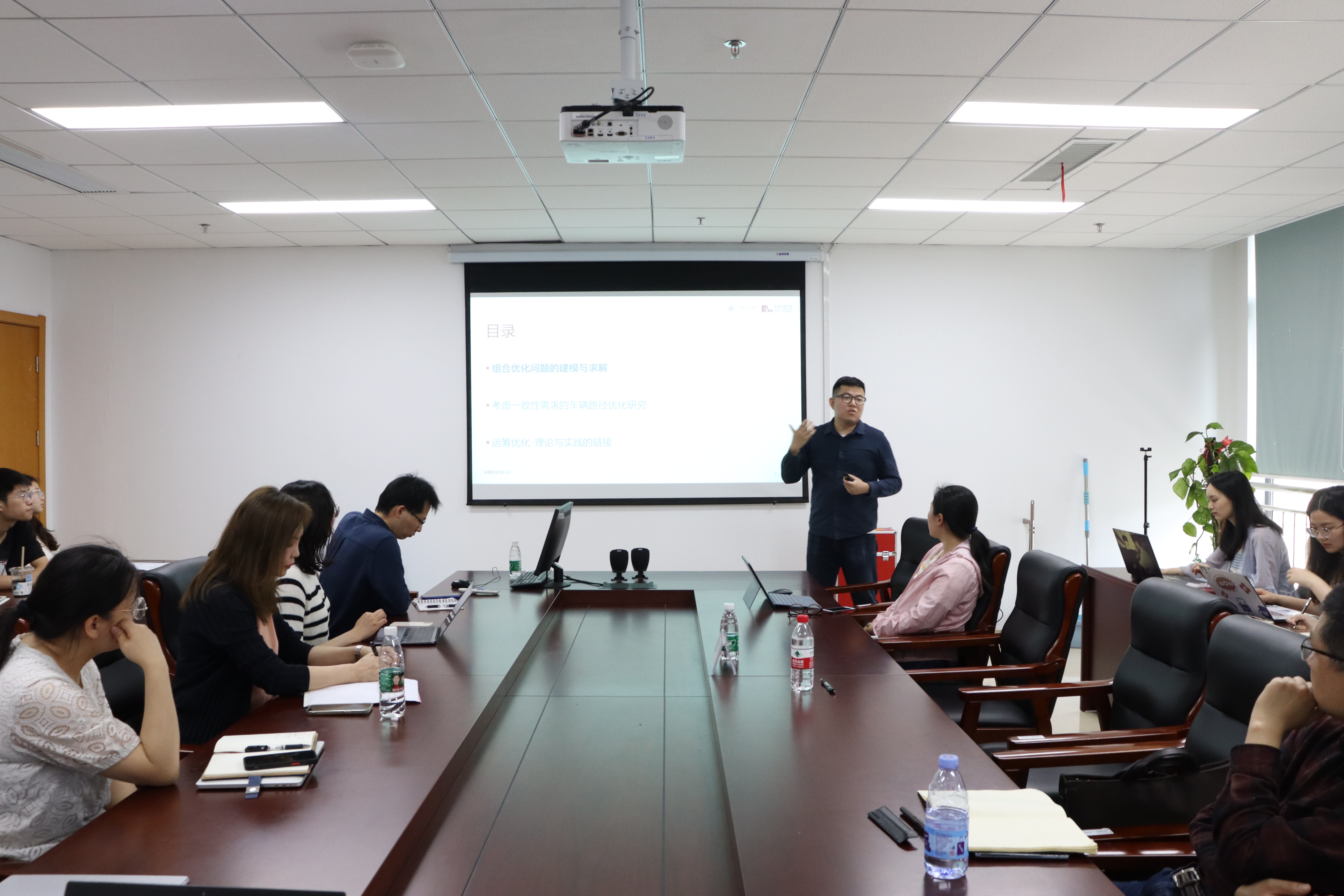 报告会上,夏老师首先介绍了组合优化在物流供应链领域的广泛应用,并聚焦物流供应链领域常见的选址问题、背包问题、指派问题、运输问题、装箱问题、最短路问题,重点讲解了建模思路和求解方法;随后,夏老师详细阐述了科研团队基于一致性需求的车辆路径优化研究(Routing Optimization with Generalized Consistency Requirements),并结合物流供应链的应用实践,分享了与美的安得智联开展的合作项目;最后,夏老师从产学研实践角度,分析了新周期下物流供应链的发展环境以及面临的挑战。