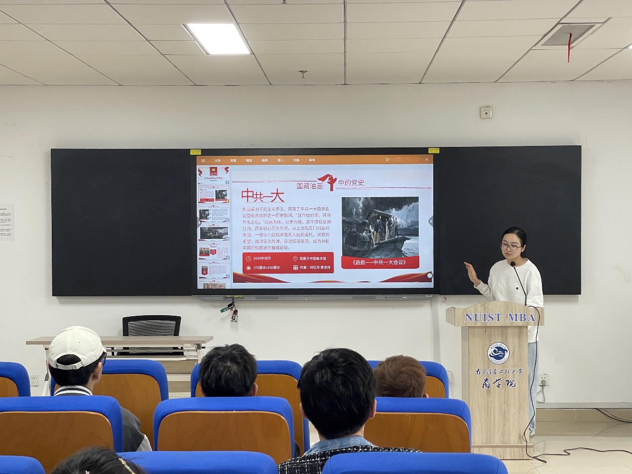 活动中,支部书记牛彦霞介绍了本次活动赏析的画作以及蕴藏在油画中的党史故事,同时邀请支部成员分享自己的心得与感受。此次赏析的红色经典画作涉及中共一大会议、南昌起义、井冈山会师、遵义会议、万里长征等重要历史节点,同学们深切的感受“以画为体,以史为魂”的峥嵘岁月,通过一幅幅画作越过历史的急流险滩,去回顾波澜壮阔的百年征程。支部党员一起探讨红色经典美术作品并深入交流,一起重温经典,感悟红色时代,赓续红色血脉。