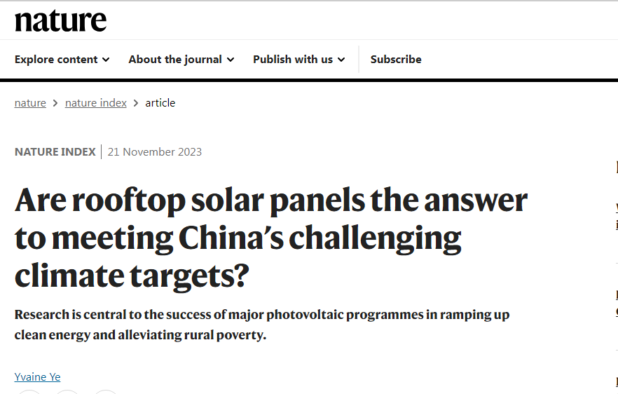2023年11月22日,《自然》杂志(Nature)发表题为“Are rooftop solar panels the answer to meeting China’s challenging climate targets?”的采访文章。在该文中,《自然》杂志就县域光伏发电项目的脱贫效果及面临的挑战等问题,对我校商学院张慧明教授进行了采访。张慧明认为光伏发电项目为中国的扶贫做出了巨大贡献。“根据国家能源局的统计,截至2020年,光伏扶贫(SEPAP)项目增加约26GW的太阳能发电能力,使4亿多贫困家庭受益,超过了10GW的初始目标”。依据张慧明教授团队对中国211个光伏扶贫示范县域数据的测算结果,2013-2016年期间SEPAP项目使人均可支配收入增加了7-8%,未来有进一步提升的空间。张慧明教授团队的合作者之一,马里兰大学的邱月明教授指出,将来应该减少SEPAP项目对补贴的依赖,与农业及其他产业融合发展是可行的举措,这样能够以更低的成本减少贫困。