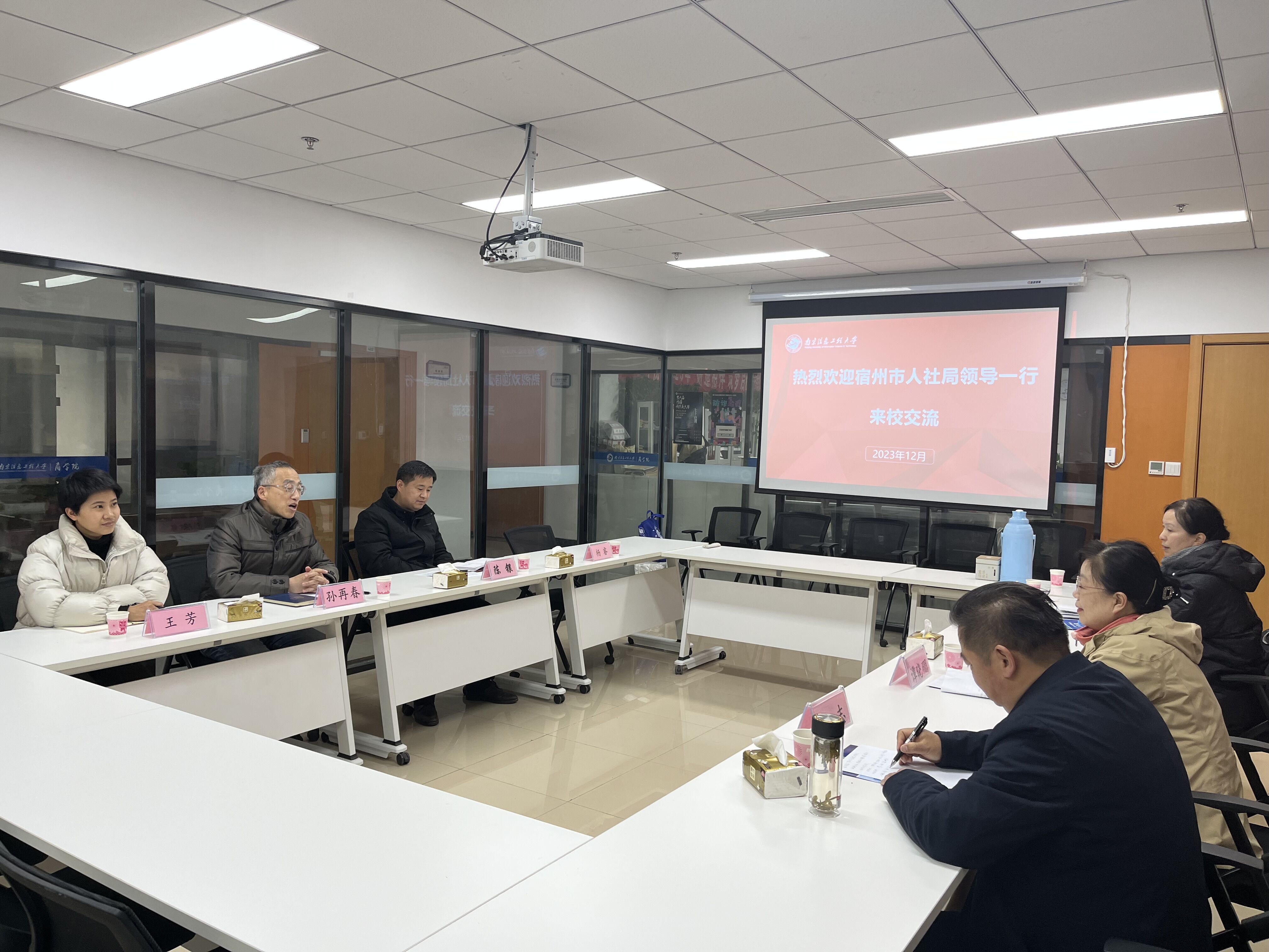 12月26日下午,安徽省宿州市人社局三级调研员谭晓硼、宿州市人才服务中心主任赵志、宿州市人才服务中心副主任牛晓萍等一行来校交流,商学院党委书记孙再春,党委副书记、副院长陈银,学办主任王芳参与调研。