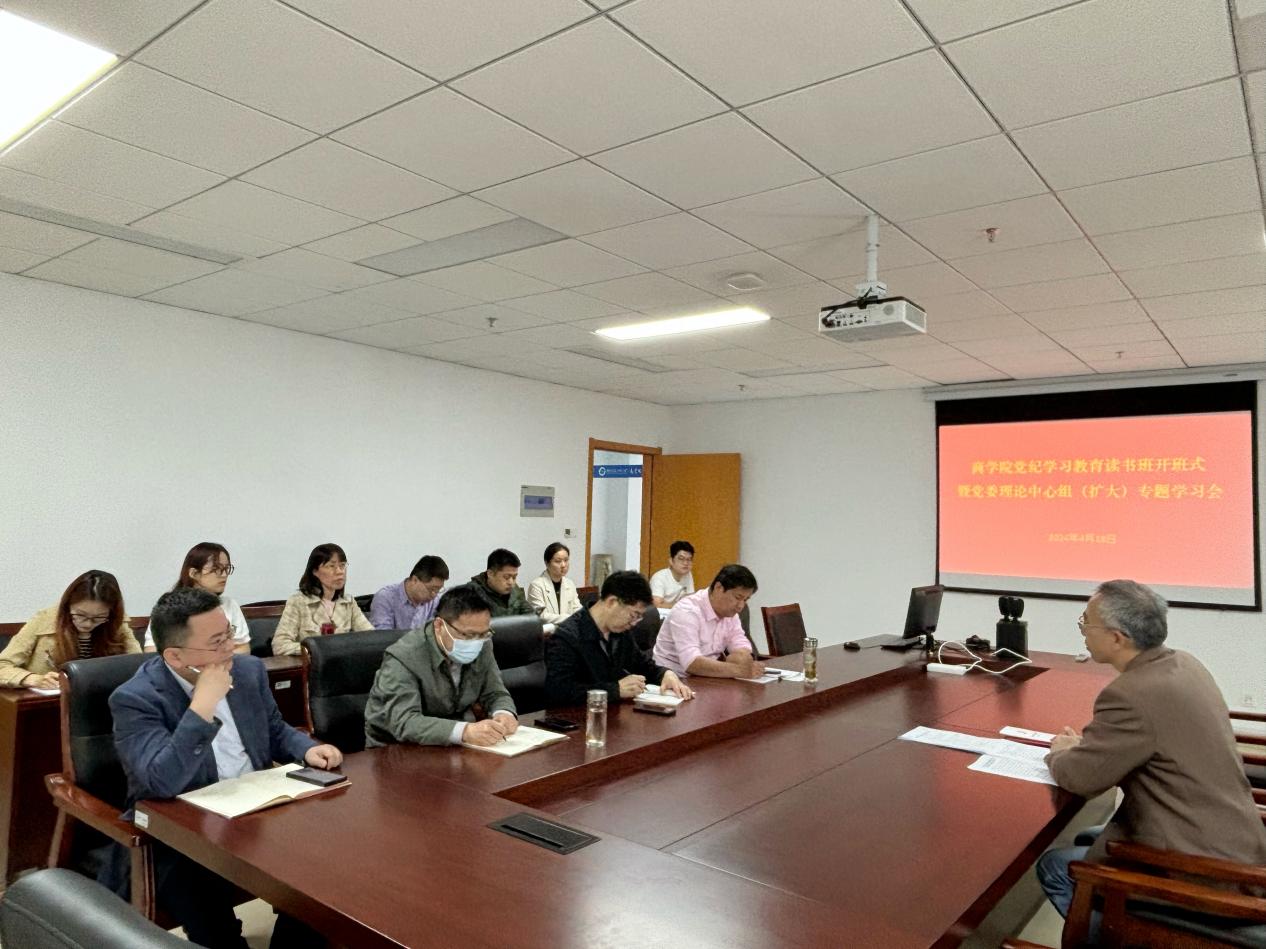 根据校党委关于党纪学习教育的统筹安排,深入学习贯彻最新修订的《中国共产党纪律处分条例》,4月18日上午,商学院党委在阅江楼502开展党纪学习教育读书班开班式暨党委理论中心组(扩大)专题学习会,商学院党委委员及各支部书记参会,会议由院党委书记孙再春主持。