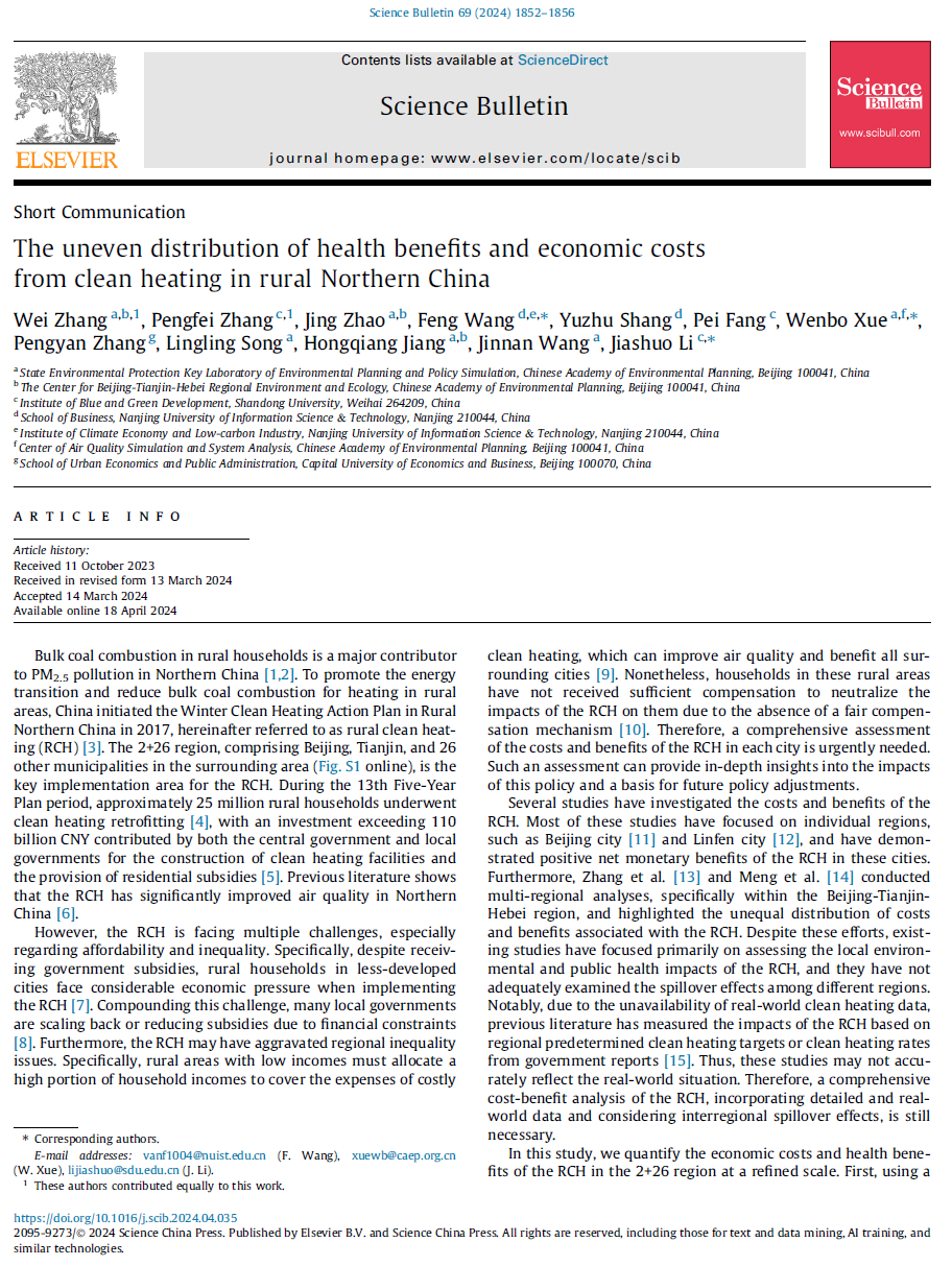 商学院汪峰副研究员作为通讯作者的论文《The uneven distribution of health benefits and economic costs from clean heating in rural Northern China》于2024年06月30日发表于中国卓越计划领军期刊《Science Bulletin》。生态环境部环境保护环境规划与政策模拟重点实验室张伟研究员与山东大学博士生张鹏飞为该论文第一作者。生态环境部环境保护环境规划与政策模拟重点实验室薛文博研究员、山东大学李佳硕教授为论文共同通讯作者。其他作者包括重点实验室成员赵静助理研究员、宋玲玲研究员、蒋洪强研究员、王金南研究员,首都经济贸易大学张鹏岩教授,南京信息工程大学商学院硕士生尚昱竹等。