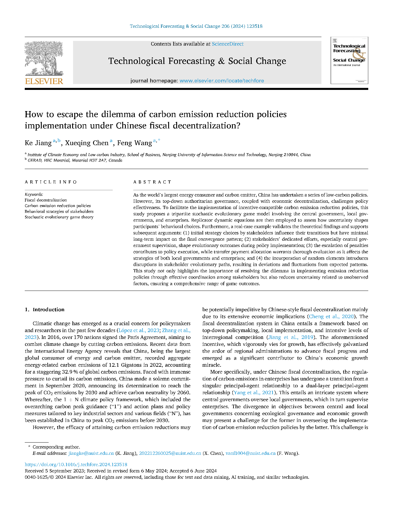 我院姜珂副教授以第一作者在ABS三星级、中科院管理学1区TOP期刊《Technological Forecasting & Social Change》发表论文《How to escape the dilemma of carbon emission reduction policies implementation under Chinese fiscal decentralization?》(2024年第9期)。我院汪峰副研究员为通讯作者,硕士研究生陈雪晴为第二作者。