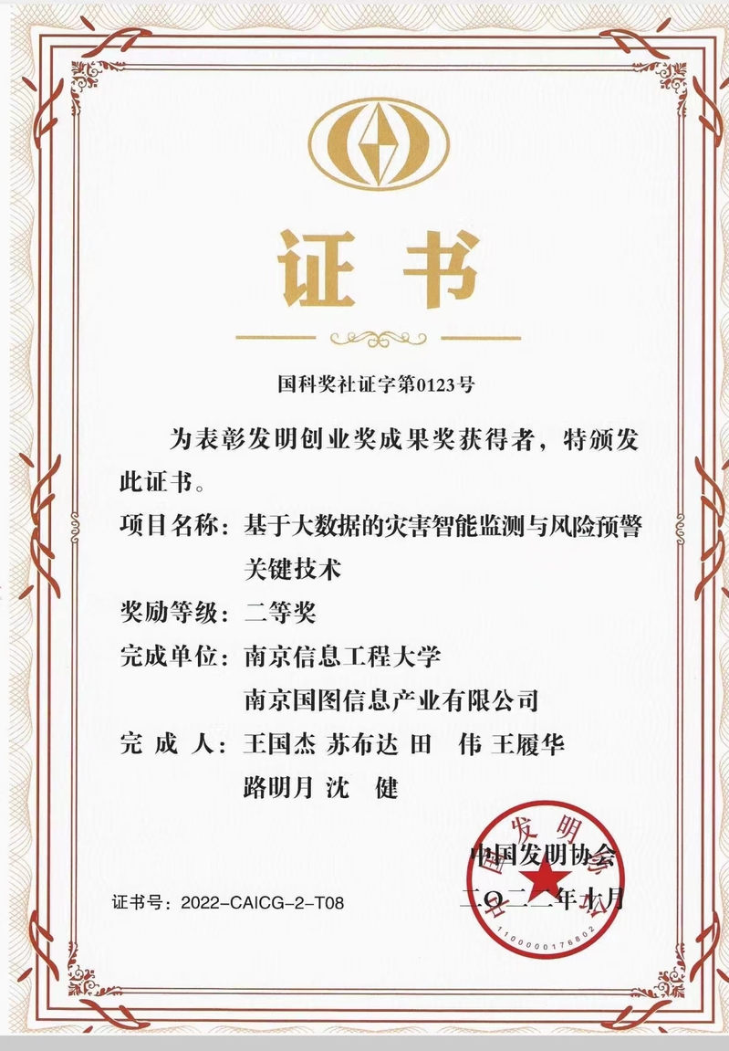 近日,王国杰教授领衔的“基于大数据的灾害智能监测与风险预警关键技术”项目,荣获中国发明协会2022年度“发明创业奖成果奖”二等奖。该项目由我校与南京国图信息产业有限公司联合申报,我校为第一完成单位。