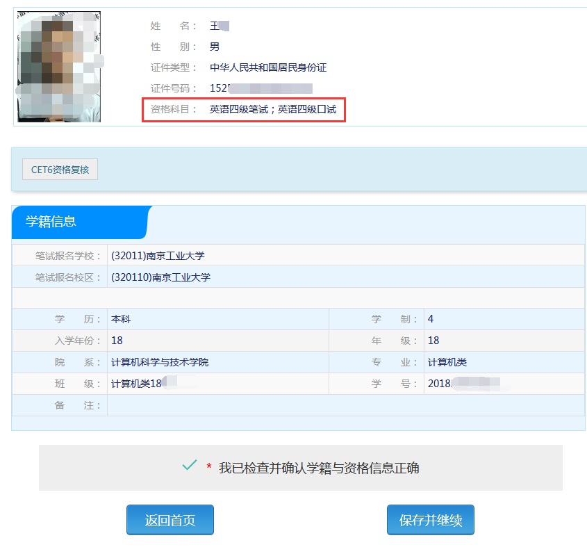 2.在“资格信息确认”界面仔细核对本人照片、姓名、证件号码、笔试报名学校、学号、班级等所有信息。