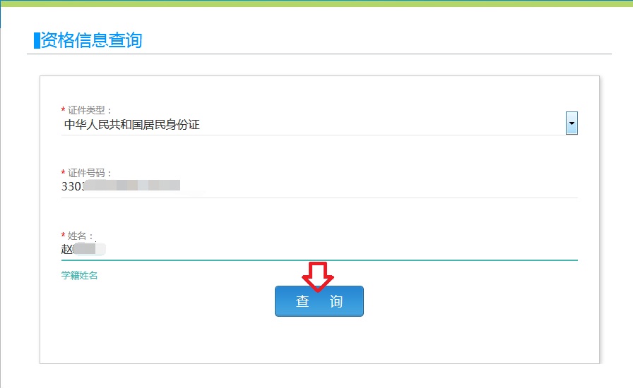 同意报名协议后进入资格信息查询界面,输入本人身 份 证号码,点击“查询”。