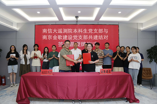 为进一步强化党建引领大学生人才培养、就业实习与创新创业,持续提升学院“立德树人”和青年大学生全面发展工作成效,6月2日,学院与南京金歌建设工程有限公司开展“南信大遥测院本科生学生党支部与南京金歌建设工程有限公司党支部结对共建”签约仪式暨就创业基地揭牌仪式。南京金歌建设工程有限公司董事长陈大金、党支部书记张娟、副总经理徐才华、副总经理陈桂霞,遥感与测绘工程学院党委副书记高盛蔷、21级测绘工程专业全体学生以及本科生党支部党员代表参加活动。活动由学院学生工作办公室主任朱亚宾主持。