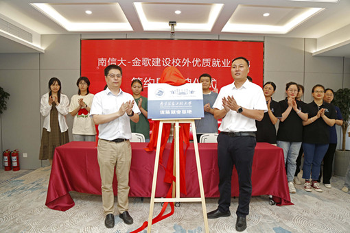 在签约仪式环节,学院党委副书记高盛蔷和金歌董事长陈大金共同签约就创业基地并揭牌。院学生工作办公室主任与金歌公司党支部书记张娟共同签约党建合作协议。