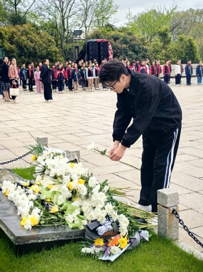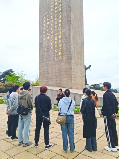 全体成员首先瞻仰了烈士就义群雕。面对雨花台北大门的烈士就义群雕气势恢弘,179块花岗岩雕刻的九位烈士屹立青松翠柏之中,淅淅沥沥的小雨更增添了肃穆悲壮的气氛。站在群雕前,同学们感受着革命烈士们宁死不屈、为民牺牲的大无畏精神。接着,大家前往雨花台烈士纪念碑,碑额似红旗如火炬,碑身镌刻邓小平同志手书的“雨花台烈士纪念碑”镏金大字。大家双手紧握白菊,排着整齐的队伍沿着台阶向上,有序向烈士们敬献鲜花,这一朵朵白菊寄托着青年学子对于革命先烈们的思念与景仰之情。