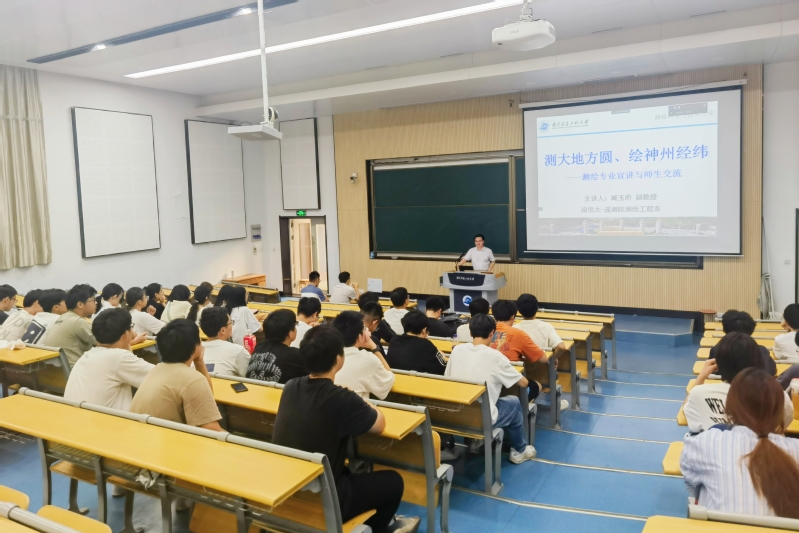 测绘工程系主任臧玉府老师首先以《测大地方圆 绘神州经纬》为题作报告。他以电子地图导航、“嫦娥号“月球探测器等为引,介绍了测绘工程专业技术在科技生产多个领域中的应用,并结合测绘工程专业技术、测绘专业的多元化应用、我校测绘工程专业的发展历史及成绩,向大家展现了测绘工程专业的全貌。遥测院院长助理丁海勇老师从产业发展、企业概况、空间布局等角度,对地理信息产业进行了全方位的阐述,他指出了该项产业发展的热点特征,包括与互联网+融合创新、与物联网融合创新、与大数据融合创新及与云计算融合创新等。测绘工程教工党支部书记何鹏飞则向大家梳理了测绘发展的历史脉络,并围绕时间、空间、时空信息等角度揭示了测绘学科的特点,他指出测绘地理信息技术具有广阔的领域纵深和应用前景,鼓励同学们要在专业领域锐意进取、勇敢探索。23测绘工程2班班主任吕逸飞老师以北斗三号全球卫星导航系统为核心,介绍了信息化测绘的优势特点及用途,引导大家扎实学好专业知识,在科创方面积极寻找新思路。